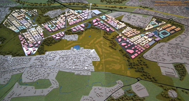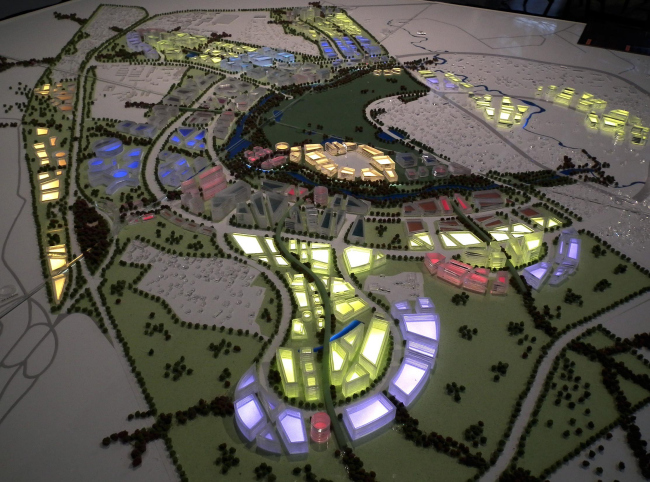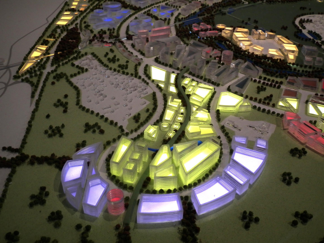 Концепция OMA (в создании которой, однако, по словам Бориса Бернаскони, сам Рэм Колхас участия не принимал) – очень рациональная и модернисткая. Как справедливо заметил Григорий Ревзин, будущий инноград в ней похож на Калининский проспект, на институты Леонида Павлова 1970-х и на компьютерную материнскую плату. От себя добавим, что еще она похожа на близлежащие совхозные сооружения, и вообще, особенно если смотреть сверху, на любые промзоны второй половины XX века. Похожа и наматеринскую плату, точнее, на склад материнских плат, по которым несколько раз ударили молотком и они разлетелись, образовав вокруг основных прямоугольников немного оживляющего их хаоса.