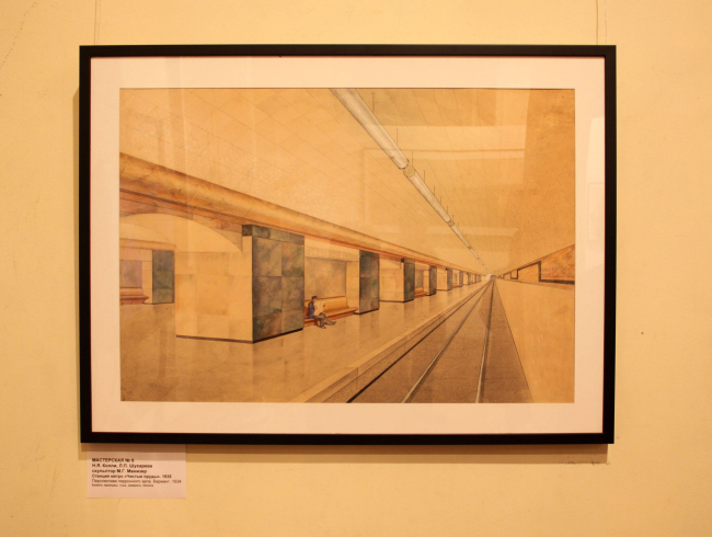 Едва ли не треть экспозиции посвящена станциям московского метро – как решениям самих платформ, так и проектам входных вестибюлей. Роскошные многоцветные отмывки демонстрируют архитектурные достоинства «дворцов для народа» во всей их красе. Колонны и своды, прорисовка карнизов и тяг, обращение к скульптуре и живописи – выставка показывает, насколько разнообразное воплощение в архитектуре первых станций столичного метрополитена нашли разные варианты классической архитектуры.