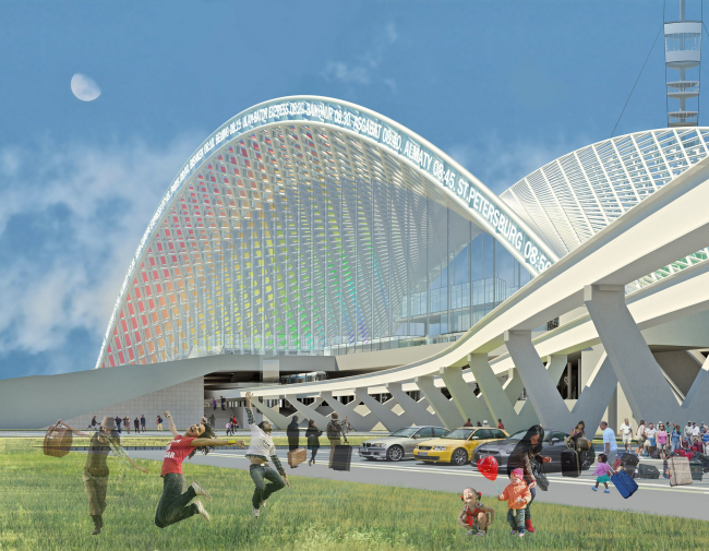 Новый вокзал будет построен в юго-восточной части Астаны, на продолжении одной из важнейших городских автомагистралей – улицы Г. Мустафина. Она ведет к самым знаковым постройкам новой казахской столицы, как уже построенным, так и строящимся, – Дворцу школьников, пирамиде Дворца мира и согласия, Президентскому дворцу, Дому Правительства Казахстана и т.д. На столь почетном фоне и вокзал просто обязан был получить соответствующий масштаб – и «Студия 44» трактовала его как «главные ворота Астаны». «Мы сразу поняли, что возвышающийся в многокилометровой перспективе улицы Мустафина комплекс должен восприниматься как Арка Дефанс в перспективе Елисейских полей, и это предопределило его архитектурное решение», – рассказывает Никита Явейн.