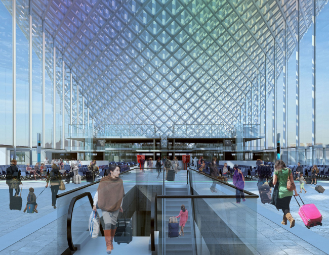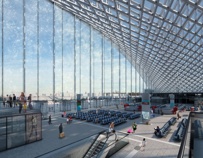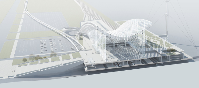 Привокзальную площадь перед главным фасадом архитекторы предлагают превратить в «террасированный парк» с искусственным рельефом, который должен оживить преимущественно плоский ландшафт города. Система террас ведет как раз к главному распределительному залу, а для тех, кому некогда взбираться по широким лестницам, предусмотрены травалаторы и пандусы, соединяющие проезжую часть с многоуровневыми парковками. Парковки скручены в тугие спирали и не просто фланкируют широкую площадь, но, как будто пружины-рессоры, связывают полупрозрачный вспарушенный свод железнодорожного вокзала с землей.