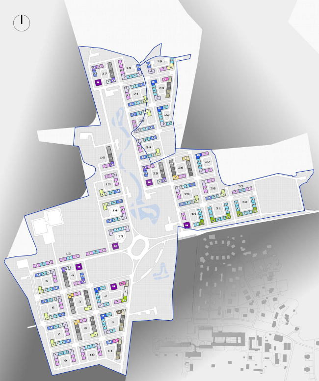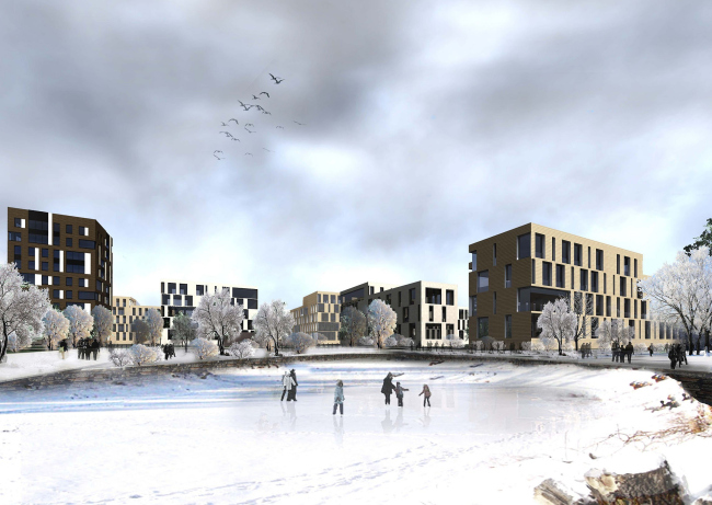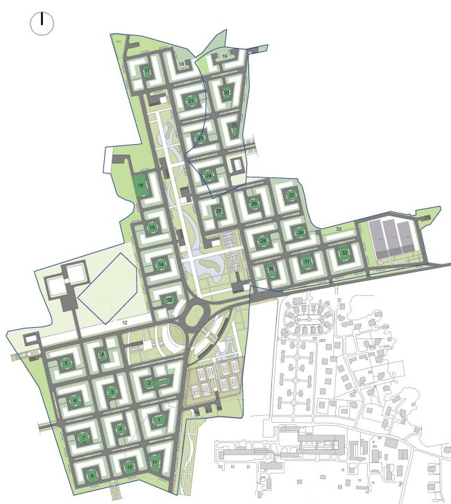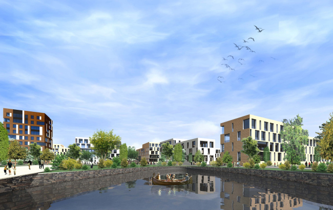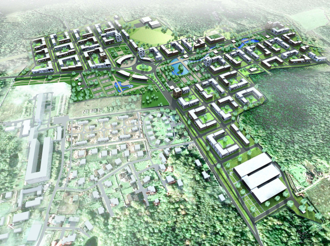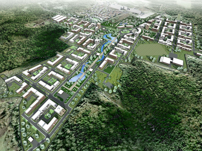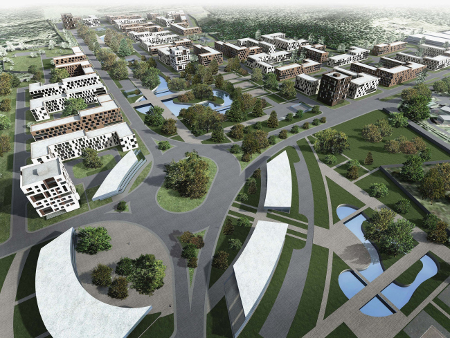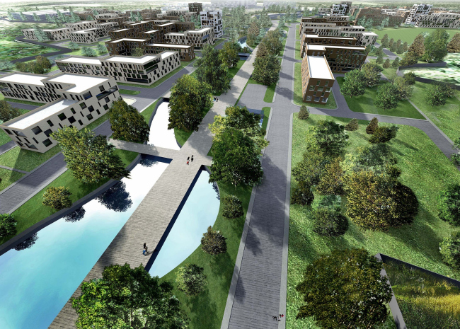 В сторону леса, перпендикулярно проезжей части, от спроектированного «шарнира» идет череда заболоченных прудов. И вновь сам ландшафт подсказал архитекторам градостроительное решение: вдоль водоемов, которые очищаются, углубляются и связываются друг с другом небольшим каналом, создается широкий пешеходный бульвар. А для того, чтобы его перспективу замыкали не больничные сооружения, овальный перекресток окружен зданиями общественного центра, в плане напоминающими распавшуюся на несколько сегментов подкову. За ними, то есть со стороны больницы, планируется разместить объекты инженерной инфраструктуры поселка, а также теннисные корты. На самом бульваре (впрочем, его внушительная ширина – около 80 метров – заставляет называть этот зеленый вектор, скорее, рекреационной зоной) место для спортивных площадок также найдется, равно как и для небольших торговых павильонов и кафе. Это, кстати, было еще одним обязательным условием ТЗ – все общественные функции должны быть вынесены в отдельные объемы, а не занимать первые этажи жилых зданий. Во-первых, на таком удалении от столицы достаточного количества арендаторов можно и не найти, а во-вторых, застройка настолько малоэтажная, что жертвовать числом квартир ради офисов просто жалко.