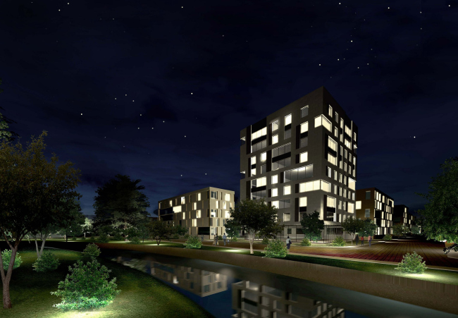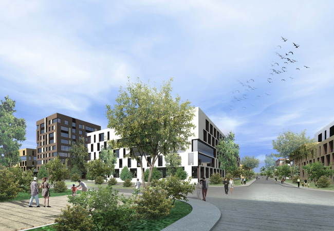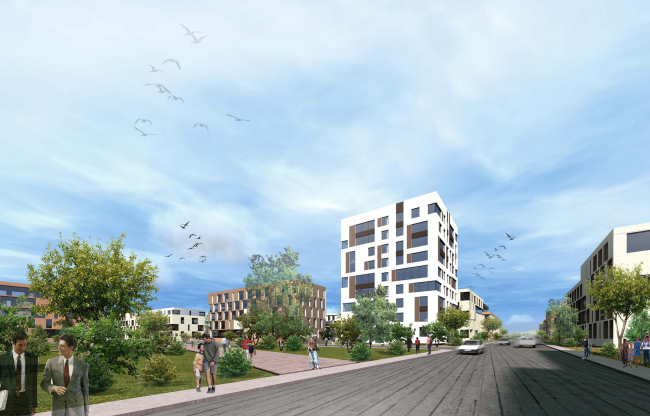 Архитектура жилых домов детально пока также не прорабатывалась, однако и на стадии концепции почерк ТПО «Резерв» узнается сразу. «Пиксельный» рисунок окон и сочетания на фасадах панелей разных цветов не только создают визуально разнообразную среду, но и скрадывают истинный масштаб редких высотных акцентов – девятиэтажных башен, фиксирующих углы выходящих на бульвар кварталов.