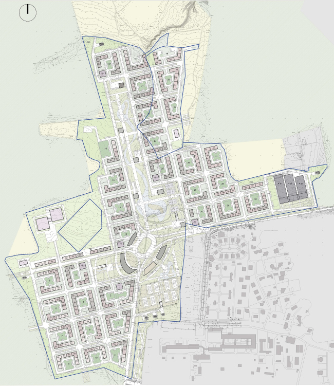 В плане участок имеет форму неправильного многоугольника и чем-то напоминает бабочку, фигурно вырезанные крылья которой с двух сторон «обнимают» больничную территорию, простираясь от нее в сторону леса. От больницы будущий жилой комплекс отделяет Ивановская улица, связывающая участок с Машкинским шоссе. Достигая центра участка, она делает плавный поворот обратно к федеральной трассе – здесь берет начало другая, пока безымянная улица, ведущая к Куркинскому шоссе. Однако и Ивановская имеет продолжение – пока в виде лесной просеки, устремленной в сторону Пятницкого шоссе. Иными словами, еще до начала проектирования жилого комплекса на его территории сложился очевидный перекресток, и идея разместить именно на нем общественный центр будущего района напрашивалась сама собой. Единственная корректива, которую архитекторы внесли в эту планировку, – овальная в плане развязка. «Во-первых, эта форма следует логике плавного изгиба главной улицы и делает пересечение дорог не столь жестким, а во-вторых, круговое движение позволит попасть без применения светофоров в любое место поселка и разгрузить перекресток, который, с учетом перспективы выхода на Пятницкое шоссе, может стать очень активным», – поясняет главный архитектор проекта Сергей Успенский.