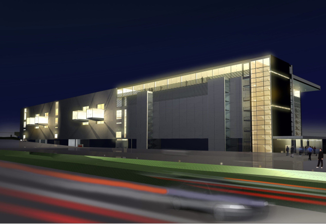 Главный фасад, обращенный к проспекту, составлен из чередующихся в шахматном порядке стеклянных витрин и равномерно перфорированных квадратными отверстиями панелей. В отверстиях светодиоды, управляемые компьютером, что позволяет составлять из точек-лампочек рисунки. Стекла витрин слегка развернуты – верхние для тех, кто едет из города, нижние в сторону машин, направляющихся в центр – таким образом они активно улавливают зрителя, стремясь удобно повернуться и показать побольше.