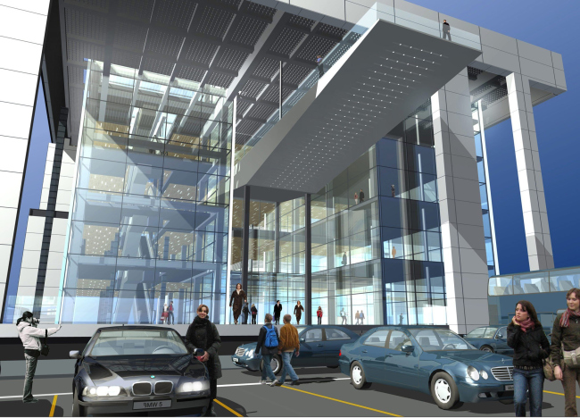 Тема витрины несколько иначе продолжается на соседней части фасада. Здесь поверхность стены прорезана двумя прозрачными прямоугольными «стержнями», тоже большими, толщиной в один этаж (больше 4 метров). Сильно выступающие стеклянные «аквариумы» вместо экзотических рыбок будут показывать проезжающим либо товары, работая как трехсторонние объемные витрины, либо – посетителей интернет-кафе, зависших в пространстве мегаполиса на 10-метровой высоте.