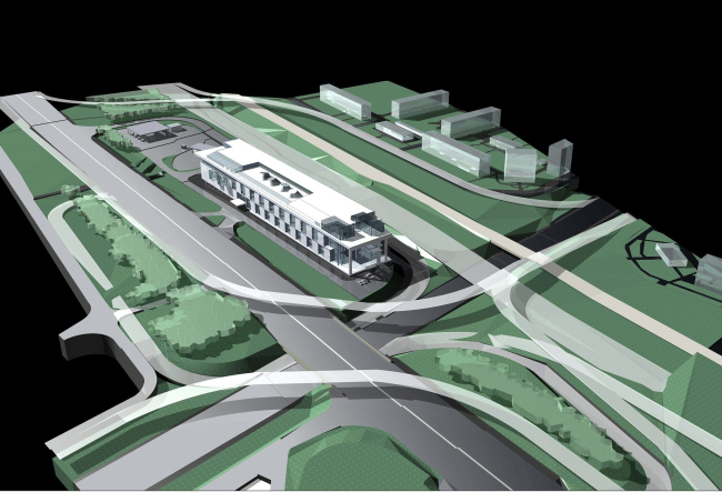 Здание торгового центра вписано в сердцевину транспортной развязки, часть которой еще только будет строится. Одна «длинная» сторона смотрит на Кутузовский проспект, другая – на его будущего «дублера», параллельную трассу для разгрузки движения. Со всех сторон машины, зато удобно подъезжать. Соответственно масштаб и фасады рассчитаны на вид из проезжающего автомобиля и представляют из себя что-то среднее между витриной и рекламным билбордом.