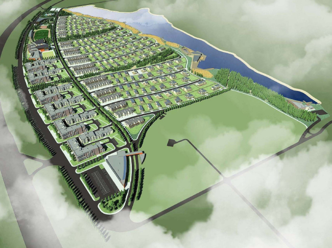 Участок общей площадью 47,8 га расположен между проектируемой федеральной магистралью и озером вытянутой формы. Трасса проходит вдоль всей юго-восточной границы участка, делая плавный поворот в сторону озера, благодаря чему будущая стройплощадка в плане приобретает очевидное сходство с расправленным птичьим крылом. Рельеф постепенно понижается в сторону водной глади, а на северо-восточном берегу озера, противоположном дороге, находится тополиная роща. Ее живописность и удаленность от трассы подсказали архитекторам решение: роща полностью сохраняется и превращается в парк отдыха, который связывает городок с лодочной станцией, рестораном и банями, расположенными на берегу.