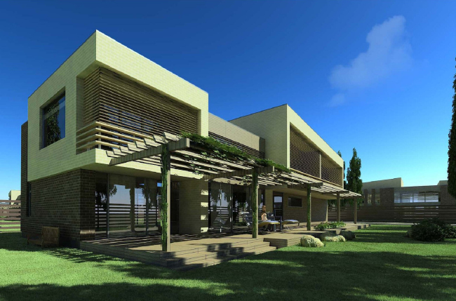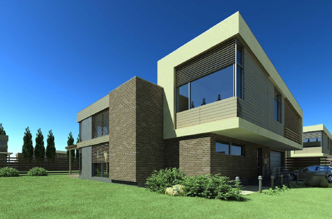Архитектура жилых домов строится на сочетании простых геометричных элементов – консольных выносов, больших квадратных окон и параллелепипедов остекленных лоджий, которые делают здания похожими на гигантские экраны. Это излюбленный прием Владимира Биндемана (достаточно вспомнить его «Дом-телевизор»), но в данном случае он доведен до логического максимума. «Мы хотели подчеркнуть южный характер архитектуры, ее расположение практически в степи, поэтому здесь так много террас, перекрытых перголами, больших лоджий и пологих кровель, а реечные заборы больше похожи на жалюзи», – поясняет архитектор. Основной фасадный материал за проектировщиков выбрал заказчик: это лицевой кирпич двух цветов – темно-коричневого и молочно-бежевого. Заданная заказчиком простота палитры не испугала «Архитектуриум»: авторы разработали десятки вариантов сочетания этих тонов, придающие объемам индивидуальный характер.