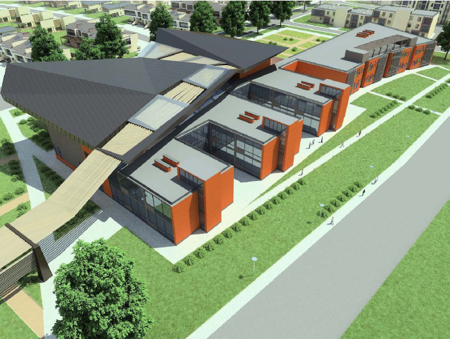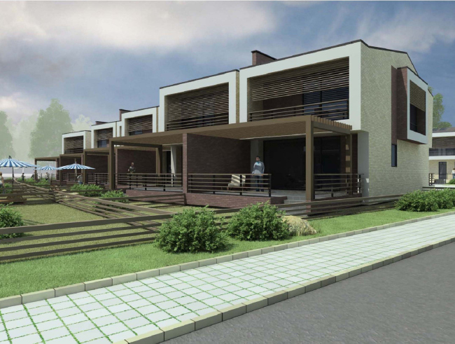 При этом, согласно ТЗ, проектируемая территория поделена на три квартала, и идея очередности строительства отражена в генплане с помощью широких зеленых клиньев, которые, как поясняет Владимир Биндеман, не только «визуально облегчают застройку, но и позволяют организовать дополнительные места отдыха». Эти аллеи связывают малоэтажную застройку с главной транспортной осью поселка – бульваром с двухсторонним движением, идущим параллельно трассе и разделяющим линии квартирных домов и таунхаусов. С объездной дорогой бульвар связан КПП, который, в свою очередь, соединен переходом с торговым центром, предназначенным как для жителей поселка, так и для автомобилистов, следующих по трассе транзитом. Единство этих объемов подчеркнуто архитектурными средствами: оба здания, несмотря на значительную разницу в площадях, имеют треугольную в плане форму и одинаковое цветовое решение, а связывающая их галерея визуально воспринимается как шлагбаум, обозначающий въезд в городок.