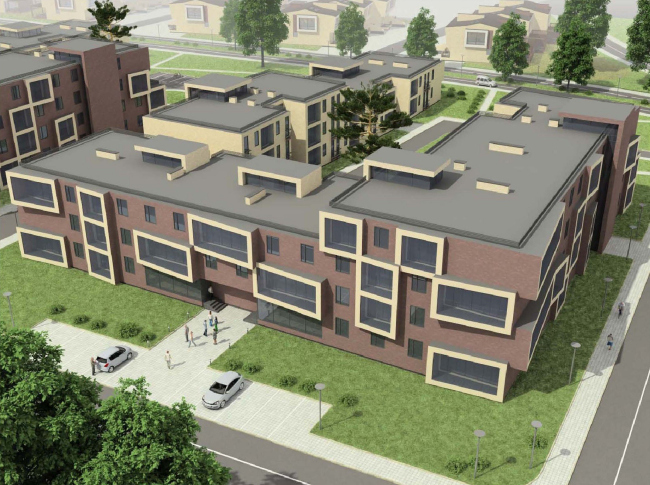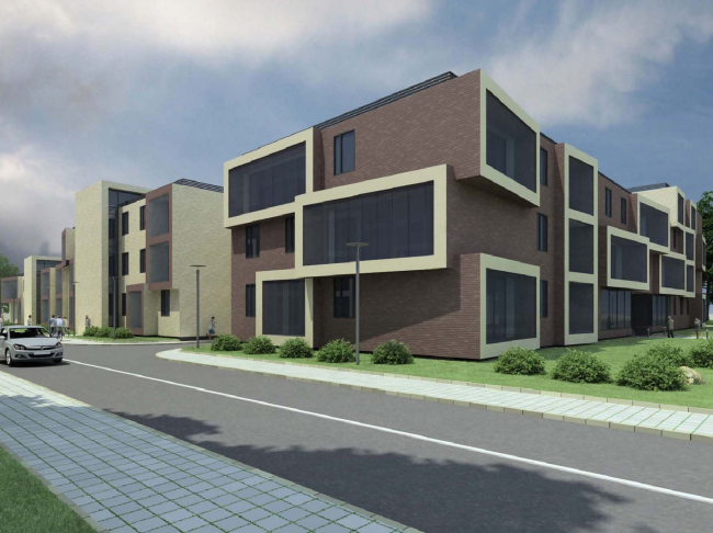 «Градостроительная ситуация продиктовала нам и композиционное решение основной застройки. Строго говоря, когда по одной границе участка проектируется шумная федеральная трасса, а вдоль другой вытянулся водоем, остается не так уж много вариантов размещения жилых объемов», – рассказывает Владимир Биндеман. Впрочем, от решения «в лоб», то есть от размещения многоквартирных жилых домов вдоль дороги, которые оградили бы городок от шума трассы, архитекторы все же отказались. Во-первых, ширина придорожной полосы, предусмотренной федеральным проектом, составляет 75 метров, что уже немало, во-вторых, параллельно будущей трассе «Архитектуриум» проектирует внешнюю объездную дорогу, с обеих сторон обсаженную высокими деревьями, и за счет этого еще дальше от нее отступает. Следующим звеном действительно становятся четырехэтажные жилые дома, но для того, чтобы избежать ощущения «забора», архитекторы организуют застройку в виде отдельных незамкнутых кварталов, внутренние дворы которых обращены к поселку.