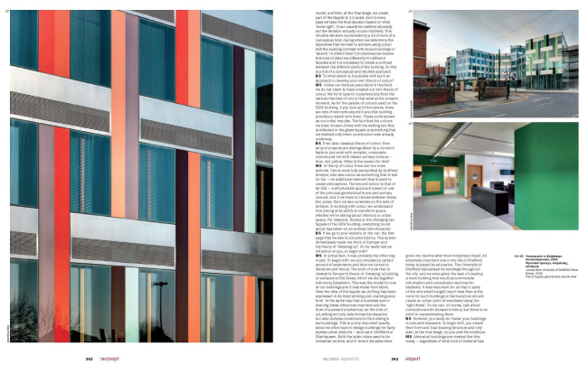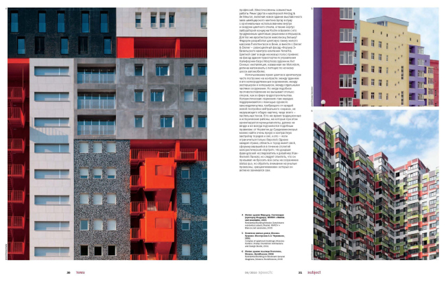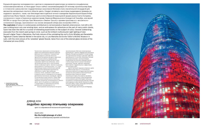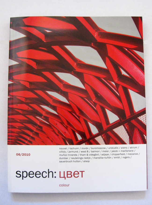 Первым новый номер приглашенным гостям представил руководитель архитектурного бюро «SPEECH Чобан/Кузнецов» Сергей Кузнецов. Он отметил, что выпуск, посвященный цветовым решениям в архитектуре, и сам получился невероятно насыщенным и ярким. Во многом это произошло благодаря выбору объектов, среди которых ярко-салатовый Центр моды и дизайна в Париже (Jakob + Macfarlane), алый Музей современного искусства в Мальмё (Tham&Videgård), синий Концертный зал Датского радио (Жан Нувель), «Город правосудия» Дэвида Чипперфильда и Школа управления «Сколково» Дэвида Аджайе. Национальным особенностям использования цвета в архитектуре в номере посвящены статьи Владимира Седова («Цвет в русской архитектуре»), Ивана Невзгодина («Колористика голландской архитектуры») и Дэвида Кона («Цвет в современной испанской архитектуре»). И если в Нидерландах и Испании традиции создания разноцветной среды обитания можно считать вполне укоренившимися, то относительно России Владимир Седов делает не столь утешительные выводы: «Несмотря на кажущуюся красочность, процесс работы с цветом в русской архитектуре, возможно, еще и не начинался». Похожую мысль озвучил на презентации и Сергей Кузнецов: «Казалось бы, мы должны быть самой разноцветной архитектурной державой, чтобы хоть как-то компенсировать серость нашего климата, однако пока этого, к сожалению, не произошло. Выпуская журнал, посвященный цвету в архитектуре, мы надеемся на то, что он хотя бы на шаг приблизит российскую реальность к многоцветию жарких стран».