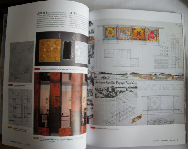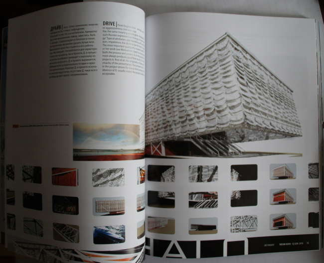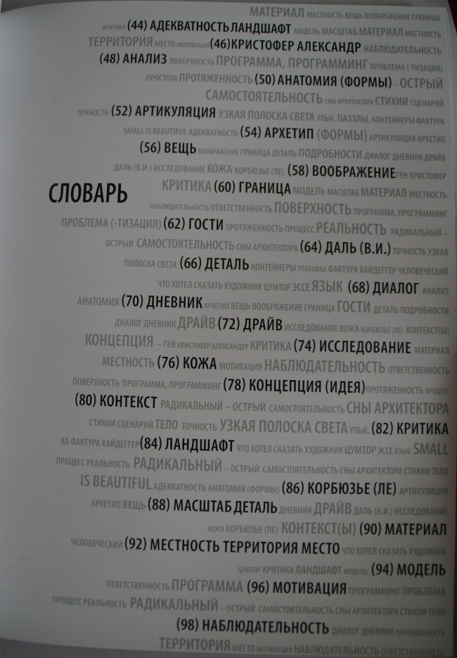 Нынешняя монография «сконструирована» с той же долей остроумия, которая отличает подачу «экспериментальных» проектов: на каждую букву идут понятия и иллюстрирующие их работы мастерской. К примеру, на букву «Д» находим: Даля В.И., автора толкового словаря, на который студенты любят ссылаться в своих исследованиях; «диалог» («опыт понимания Другого»), «деталь» («элемент здания, который может быть ухвачен рукой и ощупан»), «драйв» (то без чего не может состояться ни процесс проектирования, ни сам проект).