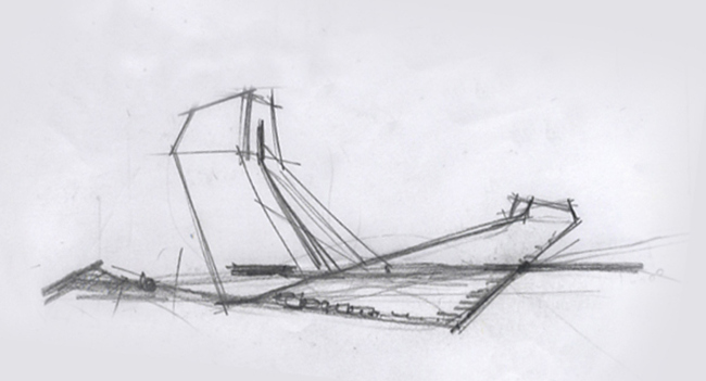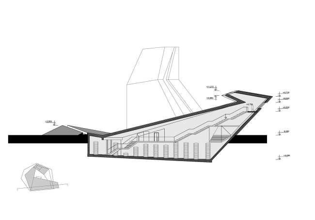В плане комплекс представляет собой пятиугольник, сложенный из двух фигур, чьи ломаные контуры напоминают оригами. Впрочем, эта ассоциация сохраняется лишь до тех пор, пока изучаешь чертежи объекта – его объемное решение гораздо сложнее. А, главное, оно непредсказуемо.