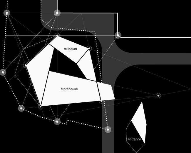 Нижняя часть музейного здания превращается в лестницу, которая треугольником врезается в горизонтальный объем хранилища. Функциональное назначение подобной экспансии очевидно: это позволит посетителям увидеть устройство последнего, не входя в него, – фактически реальный процесс выдержки коньяков разных сортов включается в экспозицию, посвященную производству этого напитка. Однако «TOTEMENT/PAPER» не были бы собой, если бы как-то не уравновесили в общей композиции комплекса это взаимодействие объемов. Поэтому завершение деревянного блока решено как «клюв», обращенный в сторону стального соседа, а его «хвост» с обратной стороны также треугольником вторгается в тело высокого объема. В этом сплетении рождается пространство с очень сложной и динамичной геометрией, символизирующее одновременно и долгий процесс производства коньяка, все стадии которого строго регламентированы, и его необходимое для этого искусство виноделов.
