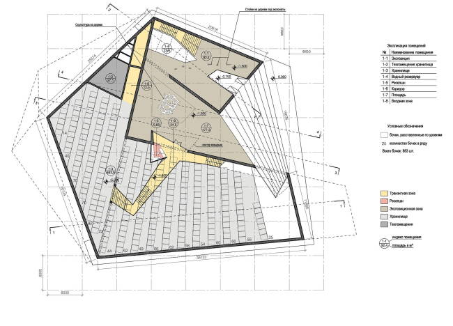 Оба здания архитекторы предлагают разместить на одной платформе, визуально связанной с основным корпусом завода. Хранилище для коньячных и винных бочек представляет собой низкое деревянное строение, словно вырастающее из-под земли. У него действительно есть несколько подземных уровней, ведь для созревания и хранения крепких напитков испокон века использовались подвалы (так, самые старые коньяки хранятся в темном глубоком подвале, который называют «Райской комнатой»).