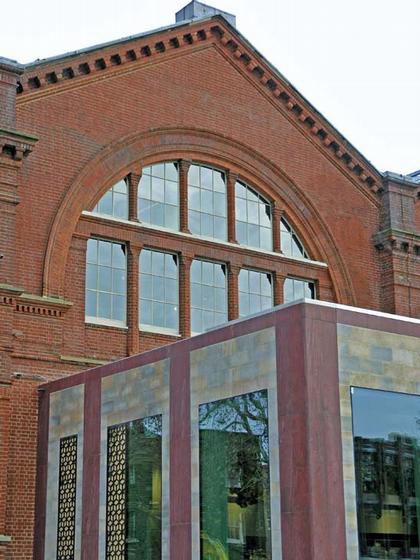 Пристройка, скрывающая в себе вестибюль, выложена снаружи плитами порфира, кварцита и известняка, которые образуют каменную мозаику, орнаментальный мотив которой напоминает трехмерную шахматную доску. Там же – уже настоящей мозаикой из смальты – выложено название музея. Архитекторы сравнивают это дополнение к основному объему здания с мраморными фасадами флорентийских базилик, остальные стены которых – как и в случае с Музеем детства – остались кирпичными.