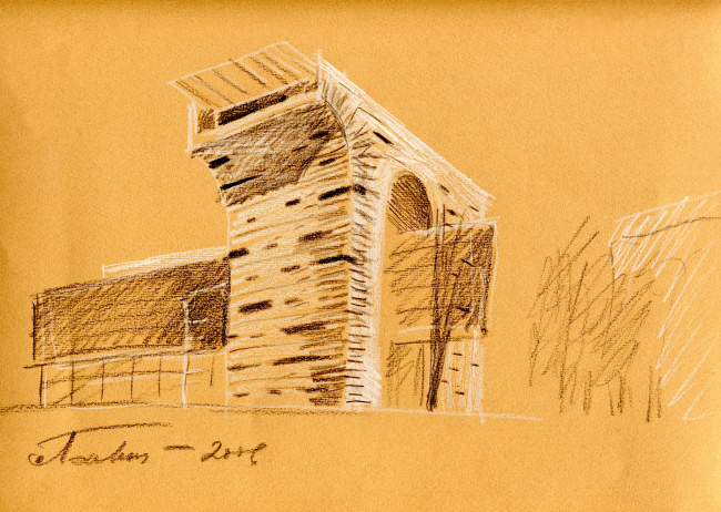 Стеклянный корпус-антагонист в противовес историзму соседа наполняется намеками на природу. Две овальные опоры сделаны похожими на гипертрофированно длинные тополиные стволы – примерно посередине они расслаиваются на два «древесных» отростка: одна с «этой» стороны держит проникший сквозь арку «нос», другая – с «той», прорастает сквозь угол с открытыми балконами. Эта тема уже была использована Бавыкиным в «тополином доме» Брюсова переулка и видимо, пришла оттуда. Но здесь стволы обобщеннее, их смысл глобальнее. Получается, что «мост» городской и каменный, он пронизан гуманитарным историзмом, а вторгающийся в него стеклянный пришелец – не просто ультра-новый, пластично-подвижный, но еще и природный элемент. Вспоминаются киплинговские джунгли, оплетающие каменный город, и выходит, что порыв нынешнего биомодернизма этим джунглям немного сродни. Дом-арка на Можайском шоссе. Проект. Эскиз. 2007 г. (первый вариант)