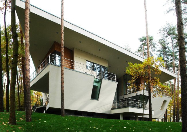 Вера Бутко вспоминает, что все началось в далеком 2004-м году, когда будущий заказчик пригласил «Атриум» участвовать в закрытом конкурсе на проект его загородного дома. Единственным пожеланием, помимо современной архитектуры, было включение в жилой объем внутреннего дворика и нескольких террас. Из него-то и родился этот необычный дом, образованный единой плоскостью, сложенной несколько раз. Поразительно, что заказчик не только согласовал, но и построил коттедж именно таким, каким увидел его на самых первых эскизах архитекторов.