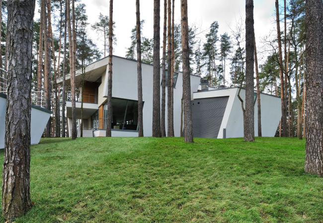 Участок, на котором построен дом, примечателен своим очень активным рельефом. В отличие от большинства соседних имений, чей ландшафт носит равнинный характер, он представляет собой высокий холм, заросший соснами. Эта возвышенность позволила разместить дом наиболее выигрышно, а сосны создали необходимую «ширму», помогающую избежать прямого визуального контакта с соседями. Соответственно, архитекторы смогли максимально раскрыть жилище навстречу природе и солнцу: три фасада из четырех имеют огромные окна самой разной геометрии.