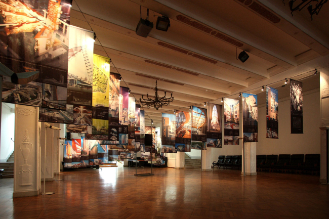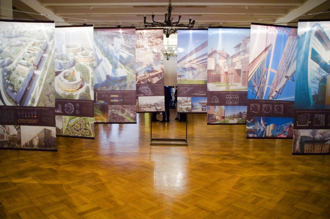 Вместо жестких планшетов архитекторы выбрали вертикальные тканевые баннеры, подвешенные к металлическим тросам, благодаря чему пространство фойе оказалось разделено на две условных «воронки»: в одной у микрофонов шло поздравление юбиляра, и официальные речи здесь незаметно переплелись с номерами дружеского «капустника» и песнями, в другой кипело неформальное общение у фуршетных столов. А больше всего поданные таким образом проекты напоминали разноцветные флаги, украсившие зал ко дню рождения их автора и своими легкостью и подвижностью символизирующие его потрясающую открытость всему новому и неизбывное стремление к свободе.