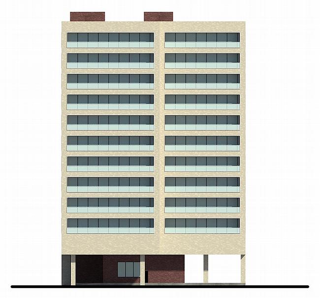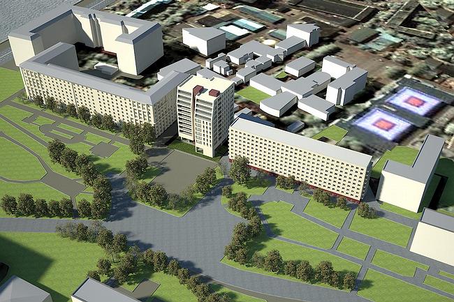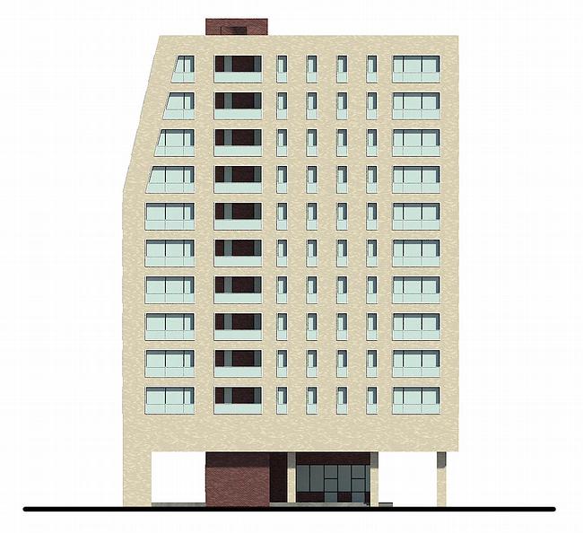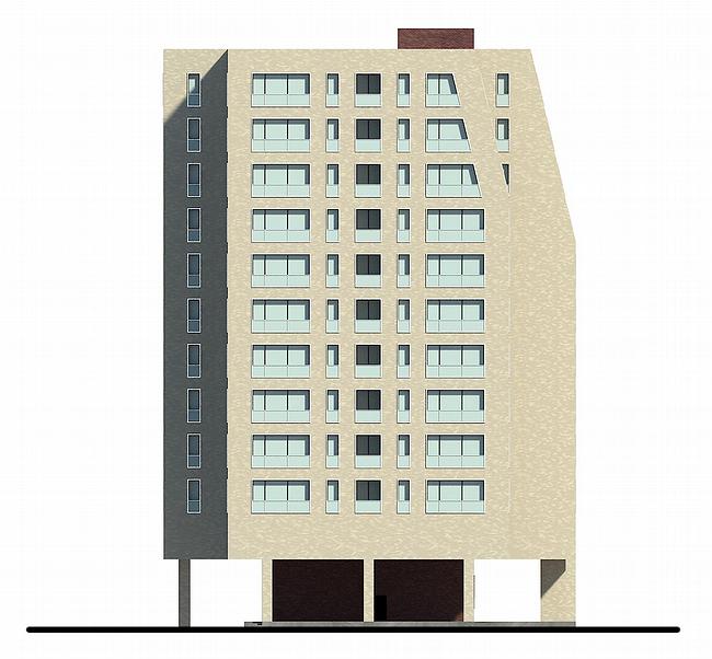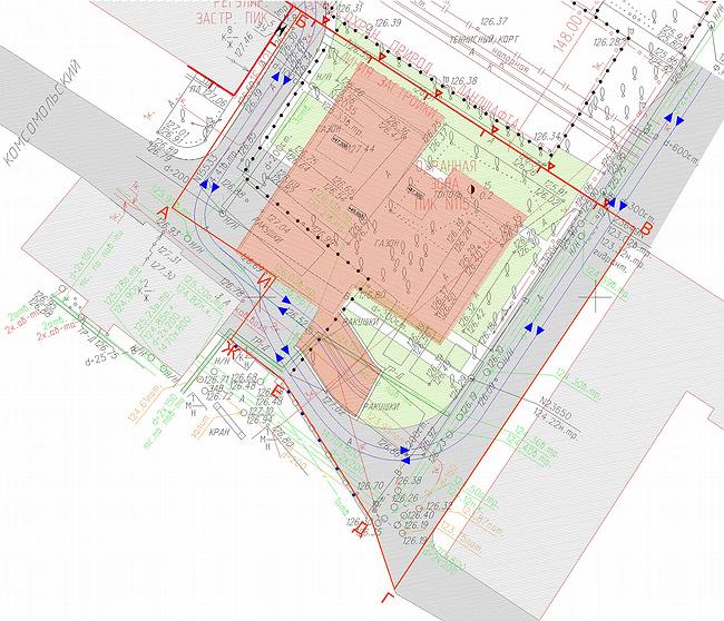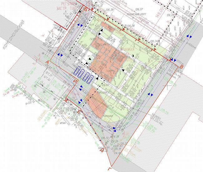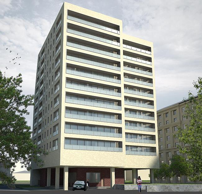 А. Иванов: Из-за того, что участок не слишком большой, у нас возникли проблемы с придомовым озеленением – не хватало места, отсюда появилось такое решение: нижняя часть дома со стороны двора максимально сжата, оставляя место только под вестибюли. Все остальное мы подняли на «ноги»-колонны, тем самым, увеличив возможное озеленение почти вдвое, существующий скверик будет сохранен, озеленение будет даже под колоннами. Под землей расположен подземный двухуровневый паркинг, который почти полностью занимает пятно застройки.