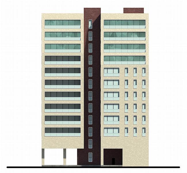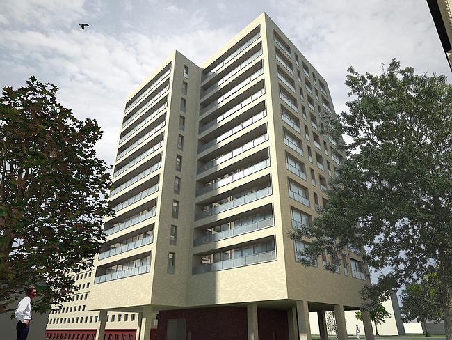 Д. Александров: План здания выполнен в форме буквы «Т», где средней связкой является лестничная клетка, а два объема – больший и меньший, напоминают пару, мужчину и женщину. То есть, один партнер, несколько более крупный, выступает вперед к красной линии и слегка обнимает лестничным блоком более тонкую и изящную, стоящую буквально «на шпильках» подругу. Так создается движение в сторону парка. Уход последними четырьмя этажами назад, о котором сказал Андрей, вызван двумя причинами: с одной стороны, мы показываем линию ограничения существующей застройки и уходим назад в глубину квартала и второе – здесь расположены лучшие квартиры, оттуда раскрываются наиболее интересные виды.