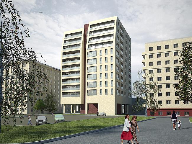 А. Иванов: Сделать качественный, но простой дом. Сложность заключалась в том, чтобы разместить жилой объем класса Делюкс на очень маленьком участке между существующими 9 и 12-этажными домами. Мы очень долго искали план здания, в котором бы учитывались все требования инсоляции, отступ от соседних домов, размещение коммуникаций. Так появился десятиэтажный объем, фасад которого состоит из двух объемов-книжек, выходящих вперед. Скосы на фасадах возникли как ответ соседнему объему – до скоса поверхность здания повторяет ритм окон стоящего справа здания, а после по наклонной плоскости идут галерейные балконы. Дом имеет два главных фасада – в сторону сквера и во внутренние дворы. Второй решен более однородно – единым росчерком простых линейных элементов с ограждениями из закаленного стекла с применением металла и ленточным остеклением.