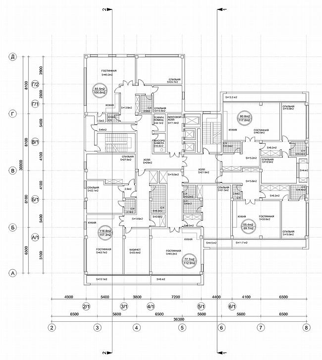 Пять квартир. В среднем. Есть варианты – 6 квартир, если добавляется маленькая квартира, studio. В верхних этажах, если понадобится, можно сделать одну большую квартиру – пентхаус. Дом получился на размером на полторы секции. Широкий корпус габаритами 36 на 30 метров (стандартный корпус – не больше 18 м). Это и не башня с одним подъездом, и в то же время не секционный дом. Затесненность участка повлекла за собой подобные решения. На верхних этажах пять квартир могут свободно превратиться в три.
