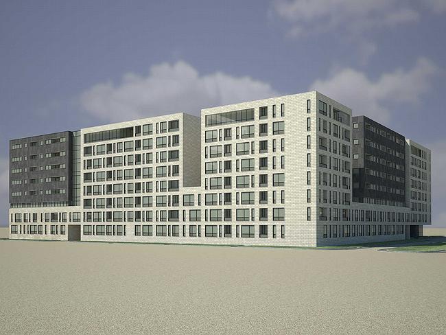 А. Иванов: Заказчик высказал пожелание, чтобы периметр здания был замкнутым каре, однако такой подход нам показался не совсем верным, особенно если представить, что находишься во внутреннем дворе, где тебя окружает сплошная девятиэтажная стена. Так возникла идея сделать некие щели, провалы в этом каре и разделить весь дом на отдельные блоки, объединенные общим стилобатом на уровне двух-трех этажей. За счет просветов внутрь дома попадает больше света, лучше проветривается и инсолируется внутренний двор. Нам показалось, что эта идея человечнее, да и просто интересней.