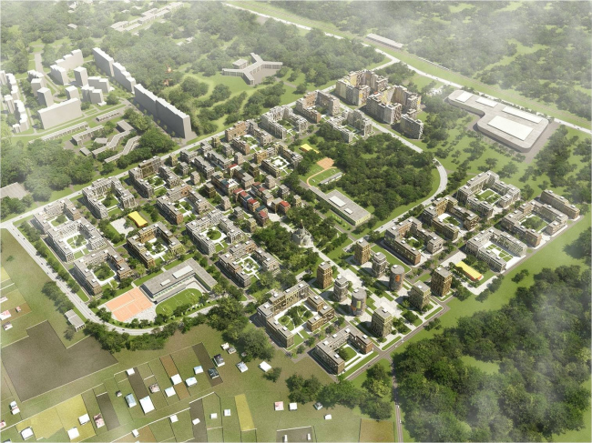 «Разрабатывая проект микрогорода, мы стремились полностью избавить его от печати типовой «постсоветской» застройки, – рассказывает архитектор Сергей Чобан. – Ключевое качество его улиц, площадей, домов – это индивидуальность, а основной принцип, заложенный в генплан, – иерархия пространств». Улицы, на которые нанизаны жилые кварталы, социальные объекты и площади, трактованы авторами не как транспортные или пешеходные хорды, но, скорее, как анфилады пространств, насыщающих среду визуальным разнообразием.