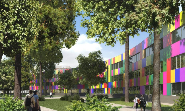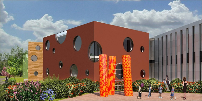 И если жилые кварталы микрогорода вписаны в ортогональную сетку генплана, то всем общественным комплексам, включая детские сады и школы, архитекторы придали совсем другую геометрию. Это здания подчеркнуто свободных, обтекаемых форм, органично взаимодействующих со своим природным окружением. Так, школа на 1100 учеников решена как широкая извивающаяся лента, к которой с одной стороны пристроены блоки спортзала, столовой и актового зала, а с другой примыкает стадион, а детские сады представляют собой отдельные небольшие домики с очень живописными фасадами, «впаянные» в овальный объем центрального атриума.