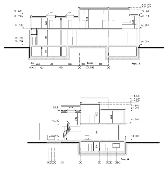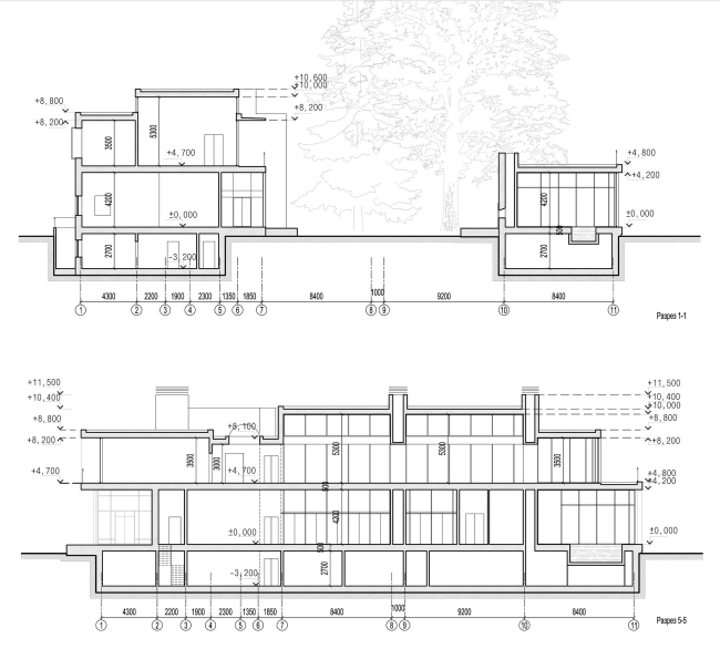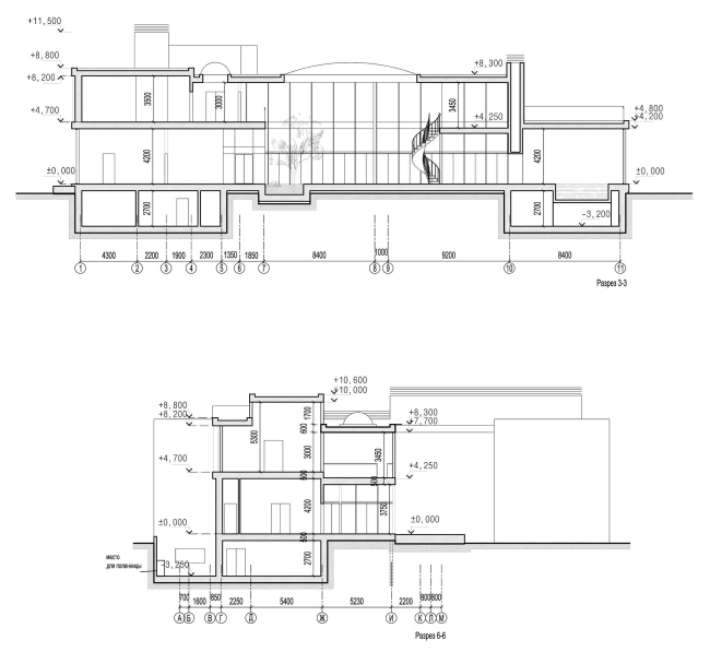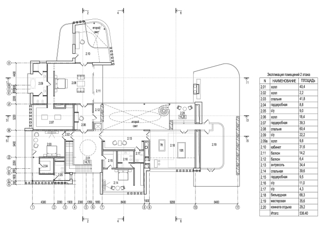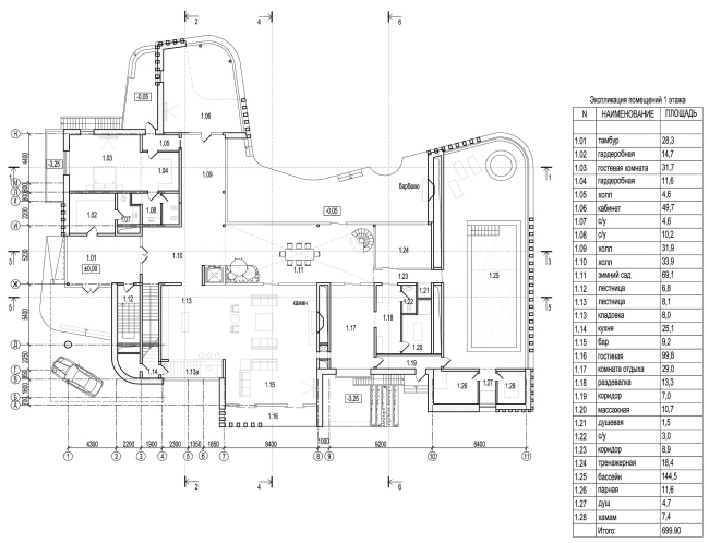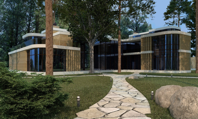 Входя мимо «колонны» в дом, попадаем в прихожую, откуда намечены два основных пути: по лестнице на второй этаж, или прямо – в зимний сад. Это длинный двусветный зал (в памяти всплывает британский long hall, по которому надо прогуливаться, ведя приличествующую положению беседу с гостями) со стеклянной стеной, обращенной к лесу. В одном конце зала – лифт и небольшая группа деревьев (собственно сад), в противоположном – изящная винтовая лестница, главное архитектурное украшение этого пространства. Посередине стол. По сути, это парадная столовая. Справа гостиная, слева спальни (они здесь окружены всеми возможными удобствами, причем косвенное назначение комнат с удобствами – звукоизоляция; гостей может быть до 10-15 человек, и они могут шуметь, не беспокоя хозяев). На отдалении, слева – двусветный кабинет с куполом, в подвале под ним кинотеатр. Прямо – бассейн, окруженный всеми радостями спа-жизни: русская баня, сауна, хамам. Словом, в доме есть все нужное для dolce far niente: из него можно не выходить днями, перемещаясь от бассейна к кинотеатру.