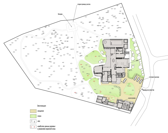 Дом планируется построить в поселке недалеко от Москвы. Участок – чуть меньше гектара, широкой стороной он обращен к дороге и вторгается в лес острым треугольным носом, обеспечивая обитателям будущего дома собственный кусочек природы. Дом построят вдоль дороги. Треугольник будет служить небольшим (лесо)-парком. Деревья вырубать не будут, в глубине поставят беседку, проложат дорожки и все будет выглядеть похожим на небольшой кусочек английского парка среднерусской усадьбы.