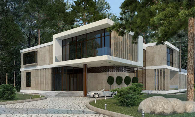 А можно и наоборот: войти, миновать тамбур, пройти сквозь зимний сад, увидеть «домашние» деревья внутри, за стеклом «дикие» деревья снаружи, – да и выйти через стеклянную стену в лес. Этому ничто не мешает. Вот и получается, что дом, со всеми его бесчисленными удобствами – всего лишь пропилеи, ворота для входа в лес. Он же – экран, лоджия, терраса – для созерцания леса, дом-резонатор, рама для общения с природой. Лес здесь хорош, и он вполне заслуженно становится главным героем и почти что – соседом. Архитекторы же делают все возможное для того, чтобы хозяева подружились со своим зеленым «соседом» – в конце концов, ведь это лес жил здесь раньше, еще до людей. Как тут не вспомнить дом прерий (вездесущего) Райта. Только в данном случае – не прерий, а подмосковной сосновой рощи. И надо сказать, симптоматично, что прижившись среди сосен, дом американских прерий стал из простого кирпичного – солидным каменным.