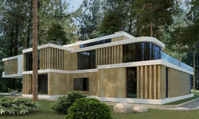 Здесь, однако, дом все же немного отступает от забора, оставляя место для узкого газона с «альпийскими» камнями; к тому же обращенный к улице фасад – это вовсе не глухая стена. Строго говоря, глядя на дом снаружи, то можно сказать, что он состоит из трех вещей: белых плоскостей перекрытий, каменных пластин стен и стекла. Стекло гнется на углах, а на крыше даже выгибается двумя пузырями куполов (больше над зимним садом и поменьше над кабинетом. Пластины камня – наоборот, строго-прямоугольные. Они щедро разбавлены вертикальными каменными «решетками», похожими на брутальные окаменевшие жалюзи. Все это распределено по фасадам асимметрично, но на стене, обращенной в сторону улицы, каменных пластин и решеток собралось больше, а со двора оказалось больше стекла. Кажется, что вот сейчас хозяин нажмет «умную» кнопку – и стены придут в движение, решетки сомкнутся, пластины расступятся, как ширмы, и уедут на соседнюю стену. Только «ширмы» исполнены из респектабельного, плотного юрского известняка, и двигаться, конечно же, не могут. Дом слишком велик и импозантен для того, чтобы быть подвижным. Я бы сказала, что в нем срослись две противоположные идеи: образ-мечта автоматизированной подвижности (из нашего времени) и реальность респектабельного, весомого камня (это из вечности). Своего рода окаменевший механизм. Но суть проекта не в этом.
