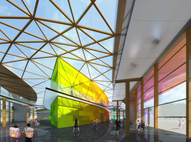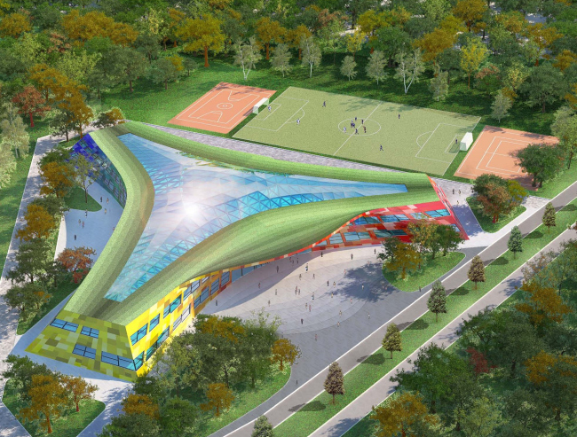 Вокруг школьного здания архитекторы планируют разместить стадион, игровую площадку и оранжерею.. Столь внушительная инфраструктура и главный объем необычной формы открывают перед будущими учениками самые радужные перспективы, причем не только в переносном, но и прямом смысле.