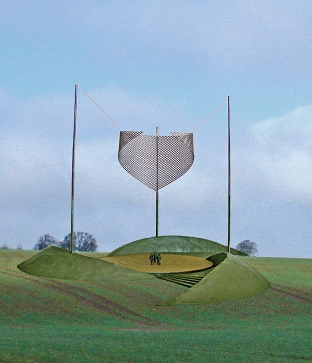 Третий участник — американский художник Нед Кан (Ned Kahn) — стал единственным, кто обратился к теме свадеб: ее развивает каменное кольцо в центре сооружения, также связанное с мегалитическими «кольцами» из камней, нередко встречающимися в регионе. Над ним на трех стальных опорах будет висеть «покрывало» — полуцилиндрическая конструкция из мелких панелей алюминия и полированной нержавеющей стали. Она будет покачиваться на ветру, напоминая о том, что воздушный «океан», в отличие от поверхности Земли, границ не имеет, и все люди на планете дышат одним воздухом.