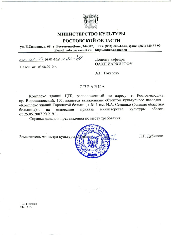 На прошедшей неделе на имя министра культуры Ростовской области А.А. Резванова поступило письмо (№01-09/1192 от 21 июня 2011 г.) от В.Г. Жданова, главного врача МЛПУЗ «ГБ №1 им. Н.А.Семашко». В письме говорится, что администрация больницы «в связи с окончанием проектирования реконструкции больницы… и началом строительства новых корпусов», просит «в оперативном порядке» рассмотреть вопрос об исключении из реестра объектов культурного наследия 3-х корпусов больницы, в том числе центрального физиотерапевтического корпуса. К письму прилагается «схема-чертеж генплана», выполненного одним из ведущих проектных институтов Ростова (Ростовгражданпроектом).