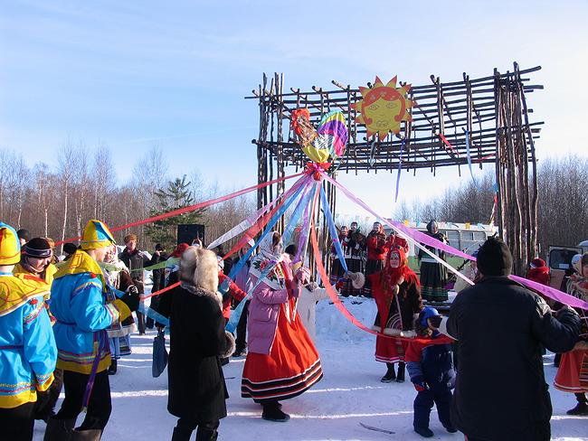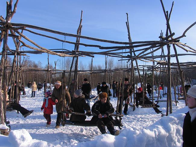 Собственно, масленица такой праздник, который всегда имел целью как-то выстроить коммуникацию между человеком и природой, преимущественно с целью воздействовать на природу – сжечь зиму, чтобы наступила весна. А коммуникация между людьми в таких случаях налаживается сама собой. Нет ничего коммуникативнее масленицы. В наше время, правда, этот праздник, многократно убитый и возрожденный, превратился в формально-народное отчасти костюмированное гуляние с профессиональными артистами в роли скоморохов. Масленица в Николо-Ленивце не такая, точнее, не совсем такая. Костюмы, угощение и «гуляние» здесь тоже были, но среди эфемерных декораций из длинных деревянных кольев. Оставшееся от летнего стояния «Николино ухо» Савинкина и Кузьмина дети использовали, чтоб прыгать в снег, а висящий над берегом реки Угры «Полумост надежды» мастерской Башкаева собрал большую очередь из желающих почувствовать состояние полёта. Общее внимание привлек колодец-«журавль», с помощью хитрого механизма опускающий и поднимающий «голову» с ведром.