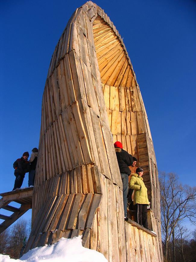 Деревня Николо-Ленивец – место концептуальное. В начале 2000-х годов здесь появились объекты художника Николая Полисского, который с помощью местных жителей построил там зиккурат сначала из сена, а потом – из дров, сплел из веток «медиа-башню» и заселил целое поле снеговиками. Затем объекты «Никола-Лениецких промыслов» стали гастролировать, то в Нижний, а то – во Францию, и наконец, прошедшим летом рамки «промыслов» расширились, к ним присоединились архитекторы, и получился фестиваль «АрхСтояние», унаследовавший свое имя от исторического стояния на Угре, когда в 1480 г. хан Ахмат пришел, постоял и ушел, на чем официально закончилось татаро-монгольское иго.
