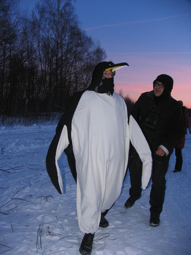 Особенно органичной красивая, но прохладная природа зимнего Никола-Ленивца оказалась для «Обледенение архитекторов», которые обледенели вплоть до превращения в крупных пингвинов. Тема коммуникации тут предстала в виде телепорта: авторы выстроили из снега кубический домик, откуда в назначенное время вышли пингвины, перенесенные, видимо, с южного полюса. Несмотря на то, что они были несколько крупнее обычных, пингвины вели они себя очень естественно – позировали фотографам, бродили по поляне, не боясь людей, и время от времени совершали брачные игры.