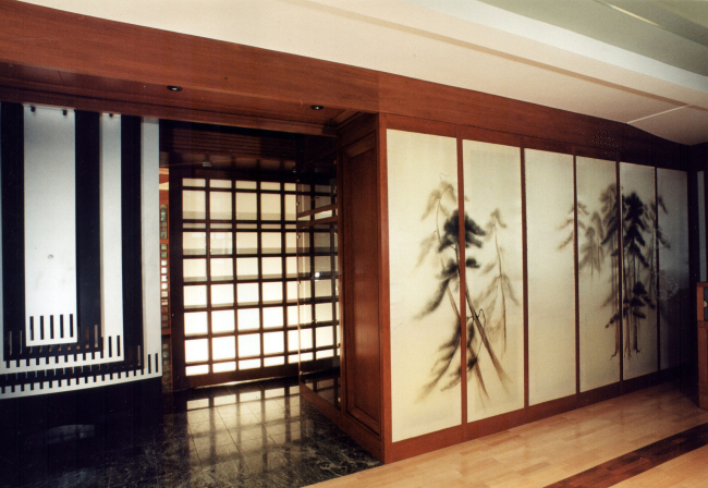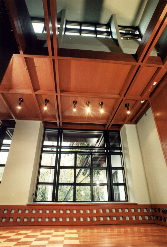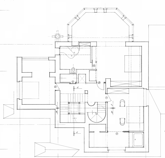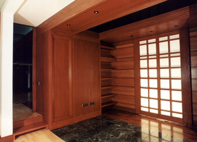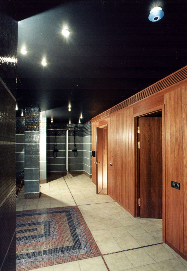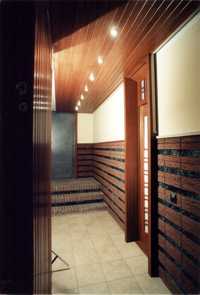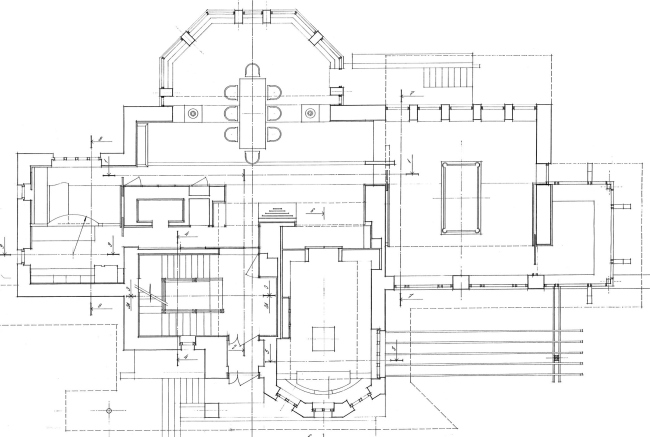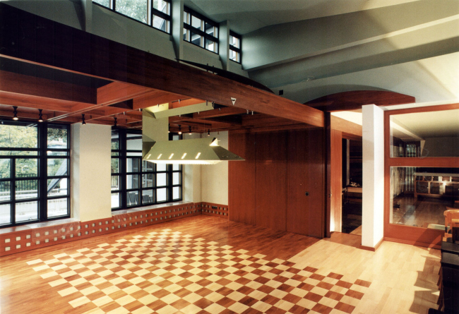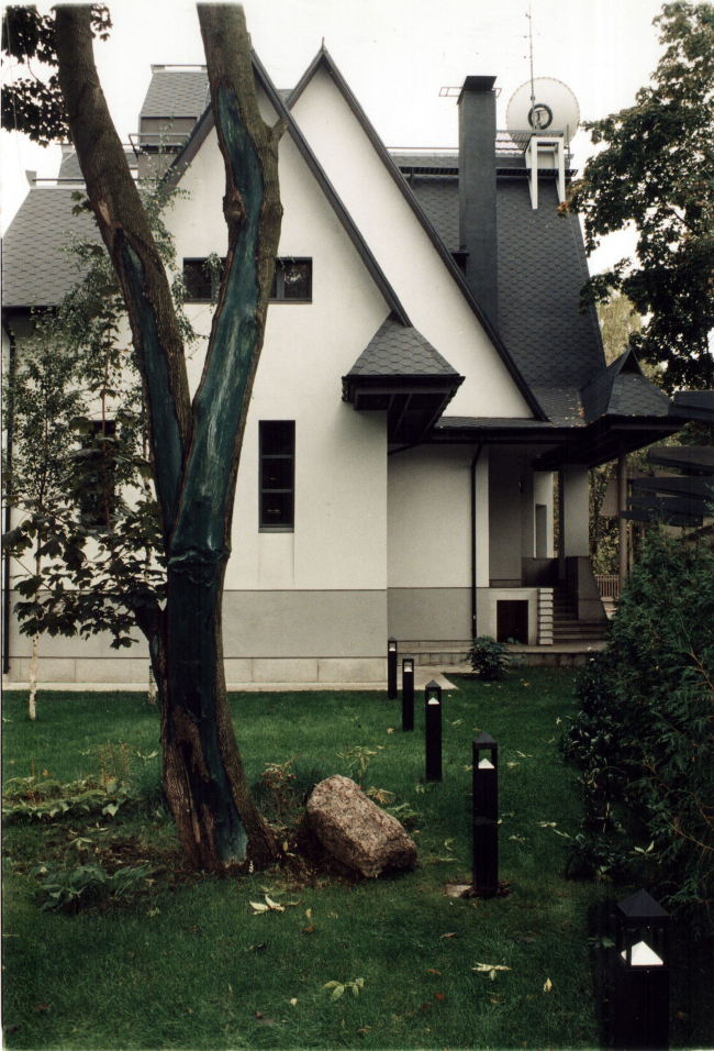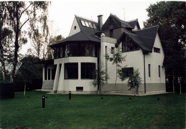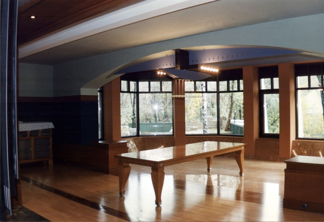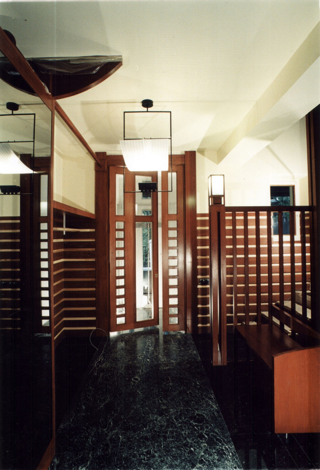 В оформлении интерьеров этого дома, который сам автор часто называет «фантазией на тему модерна» (аллюзии на северный модерн в облике этого особняка действительно очевидны), доминирует натуральное дерево разных пород и оттенков. И если снаружи особняк кажется собранным из множества разрозненных элементов, то в его внутренней структуре главенствующая роль, наоборот, отдана принципу единого пространства. В частности, все общественные зоны первого этажа Платонов увязывает друг с другом: в эту парадную часть, решенную как своеобразная анфилада, раскрывающаяся вдоль продольной оси здания, входят прихожая и лестничный холл, большая гостиная и диванная, а также бильярдная. Интересно, что эркеры при этом (один расположен в гостиной, другой в диванной) хоть и находятся друг напротив друга, но не совпадают осями симметрии: по замыслу архитектора, это привносит в пространство дома дополнительный динамизм, так как дает возможность видеть оба центра притяжения «общественной» жизни под самыми разными углами зрения. Максимально разнообразить визуальные впечатления при движении по дому и лишить его помещения замкнутости Платонову помогает и выбранный в качестве основной темы геометрический рисунок – простой, но имеющий сотни вариаций: и обшивка стен, и дверные полотна, и встроенные шкафы выполнены из деревянных пересекающих планок.