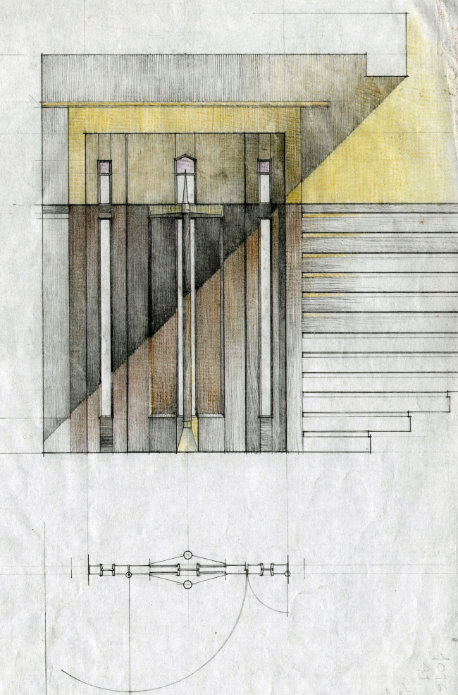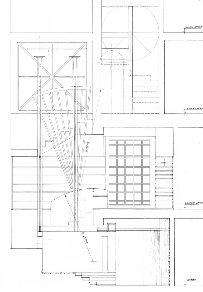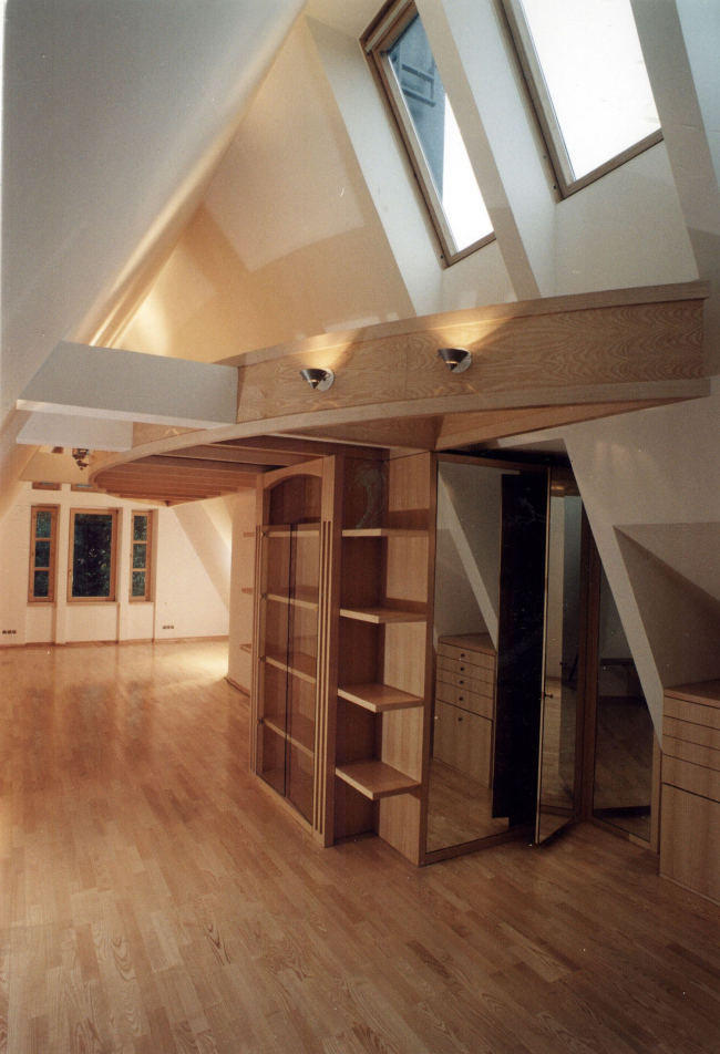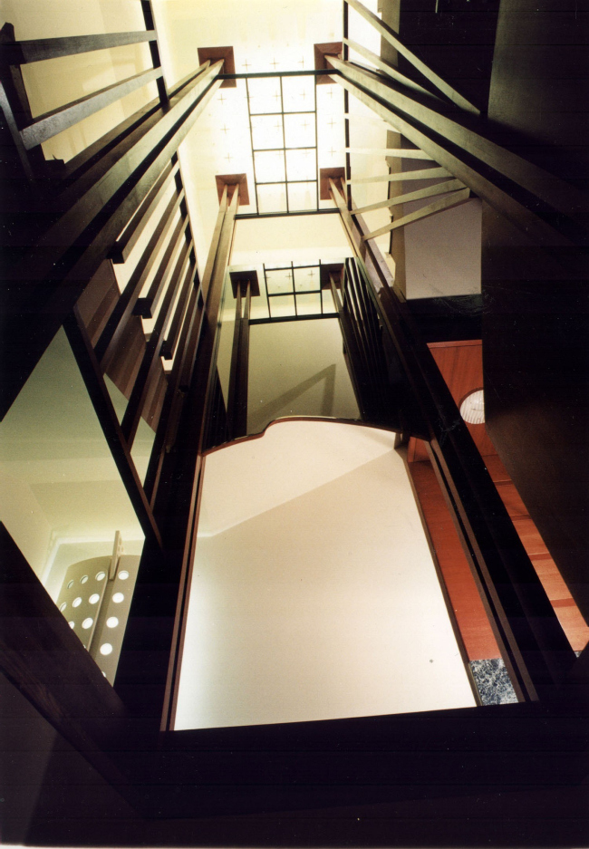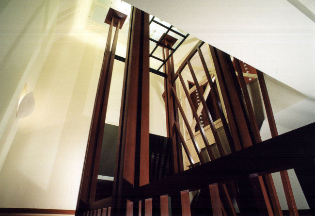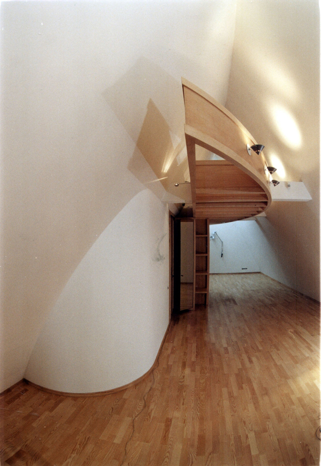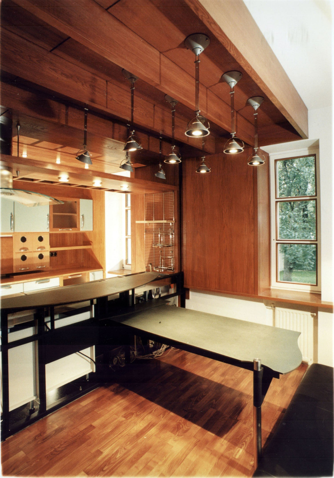 Большая часть мебели, в том числе встроенной, выполнена по авторским эскизам, придумал для этого дома Владислав Платонов и светильники – металлические остроугольные конструкции, по форме напоминающие днище корабля, – а также камин, выполненный из наложенных друг на друга в шахматном порядке черных и белых листов металла. Но, пожалуй, самым необычным элементом этого интерьера является парадная лестница, организованная вокруг псевдоатриума, потолок которого выложен панелями полированного стекла, а роль опор играют разветвляющиеся кверху деревянные колонны.