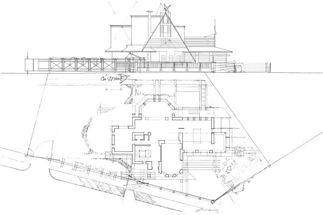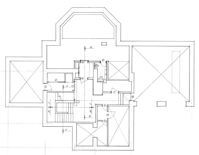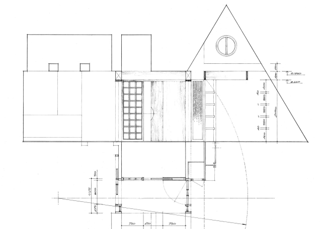В первую очередь архитектор хотел изменить масштаб тех фасадов, которые обращены к перекрестку. Чтобы сделать эти «представительские» стороны более соразмерными своим визави, Платонов притянул свесы кровли почти к самой земле, а пристроенные к основному объему гараж и веранду сделал максимально открытыми, накрыв их нарочито удлиненными навесами. Вообще все толстые, почти крепостные стены, нарисованные предшественником Платонова, в итоге были рассечены на отдельные, более мелкие фрагменты. Особенно хорошо это видно на плане: стены истончились и словно «расступились», освободив место отдельным опорам.