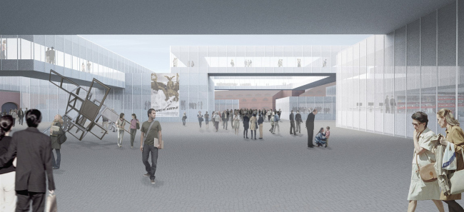 Некоторые объемы решены как обычные параллелепипеды, другие представляют собой прямоугольные «рамки» – вместе они создают систему эффектных прямоугольных порталов, ведущих к центральной площади. Зато морфологию исторических корпусов архитектор охотно сохраняет: по его мнению, крепкие кирпичные стены, арки и столбы послужат прекрасной основной для вертикального разделения зданий на отдельные «домики», в которых будут располагаться культурные и коммерческие организации, а также жилье.