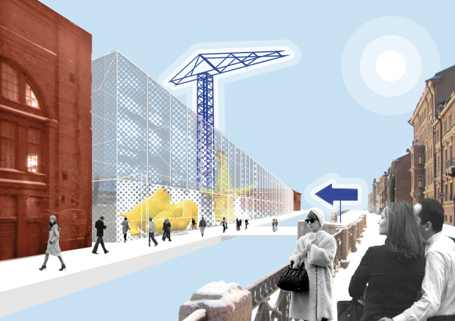 И, наконец, последний из не вошедших в шорт-лист проектов был разработан Юрием Аввакумовым и Георгием Солоповым. Здесь бывшие складские помещения целиком и полностью отводятся под художественные мастерские – студии с возможностью проживания, различные ателье и лаборатории, а также галереи, шоурумы и кинозалы. Новый театрально-выставочный корпус архитекторы назвали «Домом Чевакинского» – он возводится все там же, вдоль Адмиралтейского канала, из стекла и деревянных конструкций и своей динамичной композицией с корпусами, сдвинутыми относительно друг друга, напоминает корабельные верфи. «Так мы материализовали в форме современного здания историческую функцию хранения мачтового леса», – комментирует свой проект Юрий Аввакумов.