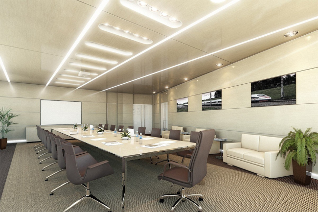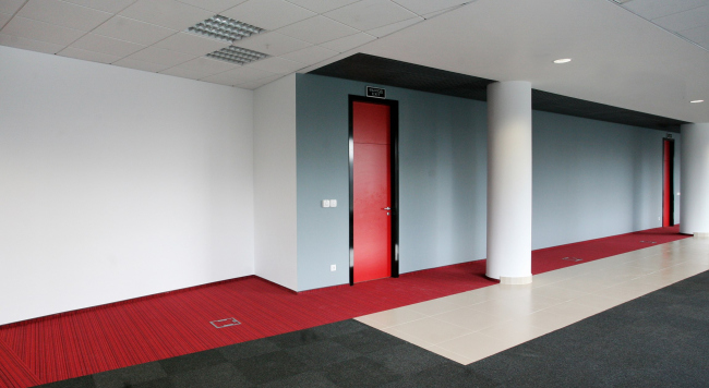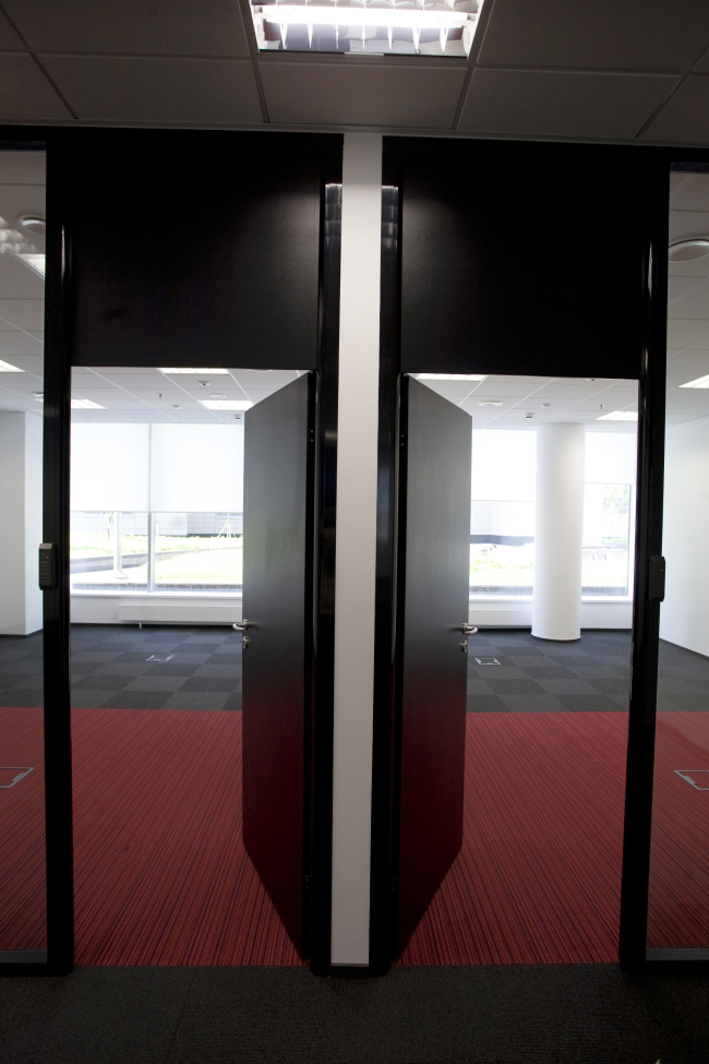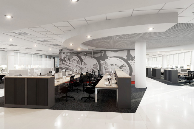 Архитекторы сделали все возможное для того, чтобы ограниченный бюджет не сказался на облике корпоративного интерьера. Поскольку работа велась над дизайном офисов сразу двух компаний, были разработаны решения, схожие типологически, но различающиеся по цветовой гамме. И там и там в основу интерьера легла классическая черно-белая схема, в одном случае дополненная корпоративным красным цветом, а в другом – синим. Варьируются и оттенки ковровой плитки, использованной в качестве напольного покрытия: в обоих случаях темные и светлые «квадраты» чередуются в шахматном порядке, но где-то это более серая, графитовая гамма, а где-то – серо-синяя. В качестве основного элемента декора использованы большие графические панно – изображения поездов, от старинных тепловозов до современных «Сапсанов», а также названия пунктов их назначения нанесены на пленку и украшают собой стены, разделяющие open space и кабинеты, переговорные и кухни. Формируется уникальный характер каждого этажа и с помощью дверей – где-то они черные, где-то белые, где-то красные, причем комбинации ни разу не повторяются.