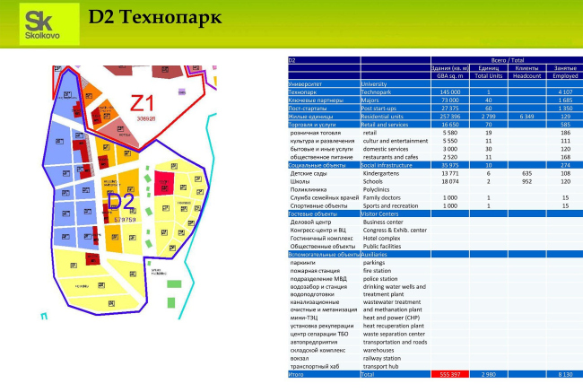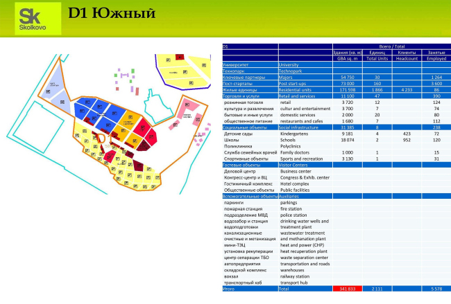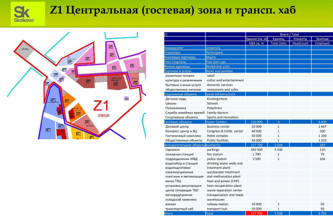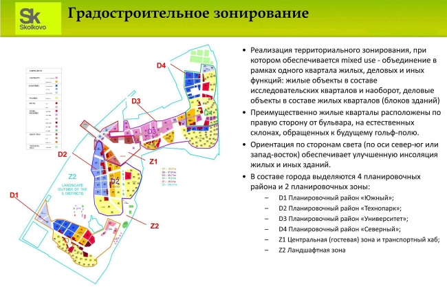 На презентации генерального плана разработчики неоднократно подчеркивали свое стремление работать с резидентами индивидуально, подключая их на начальном этапе к формированию структуры застройки. В частности, уже сейчас в уточненном генплане под размещение ключевых партнеров выделены специальные зоны, на которых будут проектироваться здания по конкретные компании. Эти зоны не будут изолированы внутри особых привилегированных территорий, а рассредоточатся по трем из пяти основных районов иннограда: южном (D1), северном (D4) и районе «Технопарк» (D2). Исключение составляют район «Университет» (D3) и Центральная зона (Z1). Точно так же будут распределены по 4 районам (включая Университет) офисные комплексы, предназначенные для start-up- и post-start-up-проектов, а также жилые здания и социальная инфраструктура. По словам разработчиков, они отказались от идеи жесткого функционального деления между районами на «деловые» и «спальные», чтобы избежать перекосов в распределении людей по территории города в течение дня. За счет комбинирования в границах одного района жилья и мест работы разработчики намерены снизить нагрузку и на внутренние коммуникации иннограда, среди которых приоритет будет отдан пешеходному сообщению. Кроме того, внутри Сколково можно будет передвигаться на велосипедах, общественных автобусах на биогазе и электромобилях. Весь личный транспорт будет сосредотачиваться на перехватывающих паркингах на въездах в инноград, вместимость которых должна составлять не менее 10 тысяч машиномест.