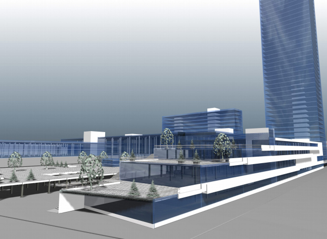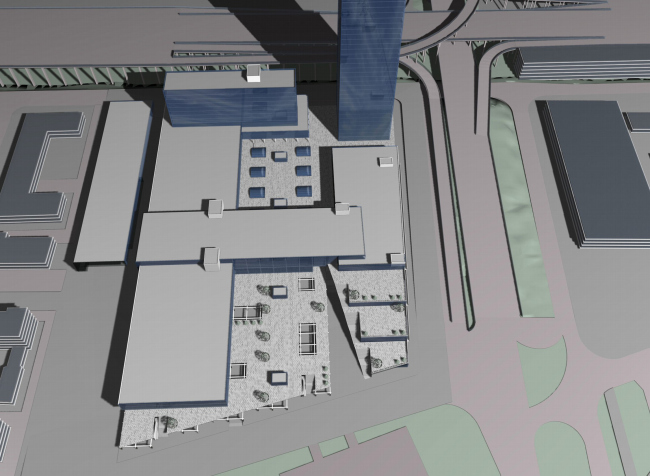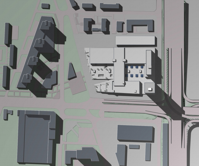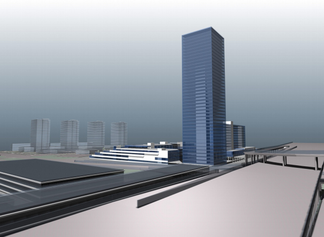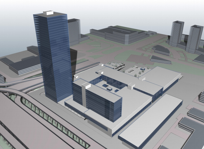 Комплекс займет просторный участок между выходом из метро и железной дорогой и шоссе. Со стороны будущего 4 кольца, чтобы было удобно подъезжать, строятся офисы и гостиница при них, «высотная» часть проекта. 40-этажная башня, уместная в масштабах современной автомобильной трассы, «фиксирует» угол перекрестка, претендуя на роль новой доминанты района. Пластина гостиницы отгораживает остальной комплекс трассы кольца, может быть, немного защищая от шума. Вторая часть комплекса, в противоположность небоскребу распластана по большей части территории, вытягиваясь в сторону метро, как если бы «башня» и «пластина» отбросили вечером длинные тени, материализовавшиеся в виде 2-3 этажей. Или в виде «горизонтального небоскреба» - его очень напоминает вытянутый левый корпус.