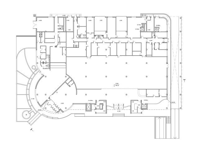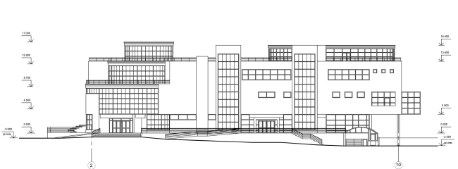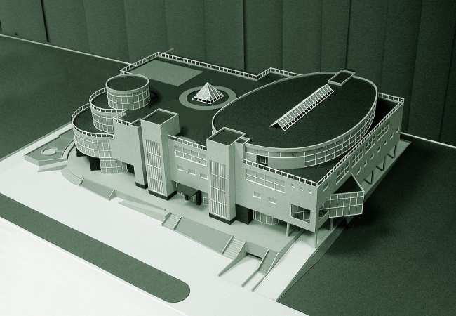 Самый пластичный акцент – трехступенчатая башня на входе, на углу со стороны метро. Это парадный вход, и каскадность круглых террас привлекает к нему внимание прохожих (и проезжающих по улице). К тому же округлая пирамида «отвечает» соседнему круглому дому-башне, и вместе они образуют своеобразные пропилеи при въезде внутрь квартала. Внутри ступенчатая башня не имеет перекрытий – это двухсветное пирамидальное пространство входного атриума; а в самом верхнем цилиндре планируется поместить выставочный зал, круглый и светлый из-за стеклянных стен. Оттуда можно будет выйти на крышу – на ней запланированы веранды кафе и даже спортивные площадки. Там, на кровле, посетителей ожидает еще один округлый объем, большой стеклянный овал, освещенный ленточными окнами со всех сторон – кстати говоря, тоже намекающий на прообразы классического авангарда.